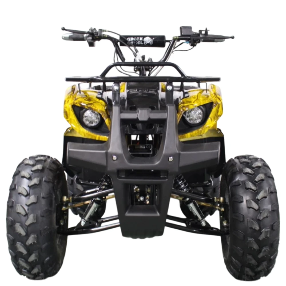 Данный квадрик обладает пониженной передачей, барабанными передними тормозами, а сзади - ножным дисковым гидравлическим тормозом. У него тихий и мягкий ход из-за отсутствия цепной передачи и наличия дифференциала.