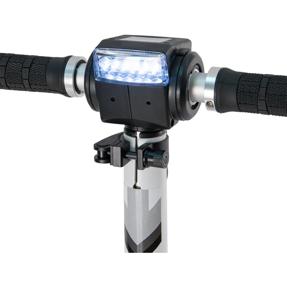 Электросамокат Generic E-twow S2 BOOSTER на рулевой стойке имеет светодиодную фару, информационный дисплей, на котором отражается скорость, заряд батареи, длительность хода.