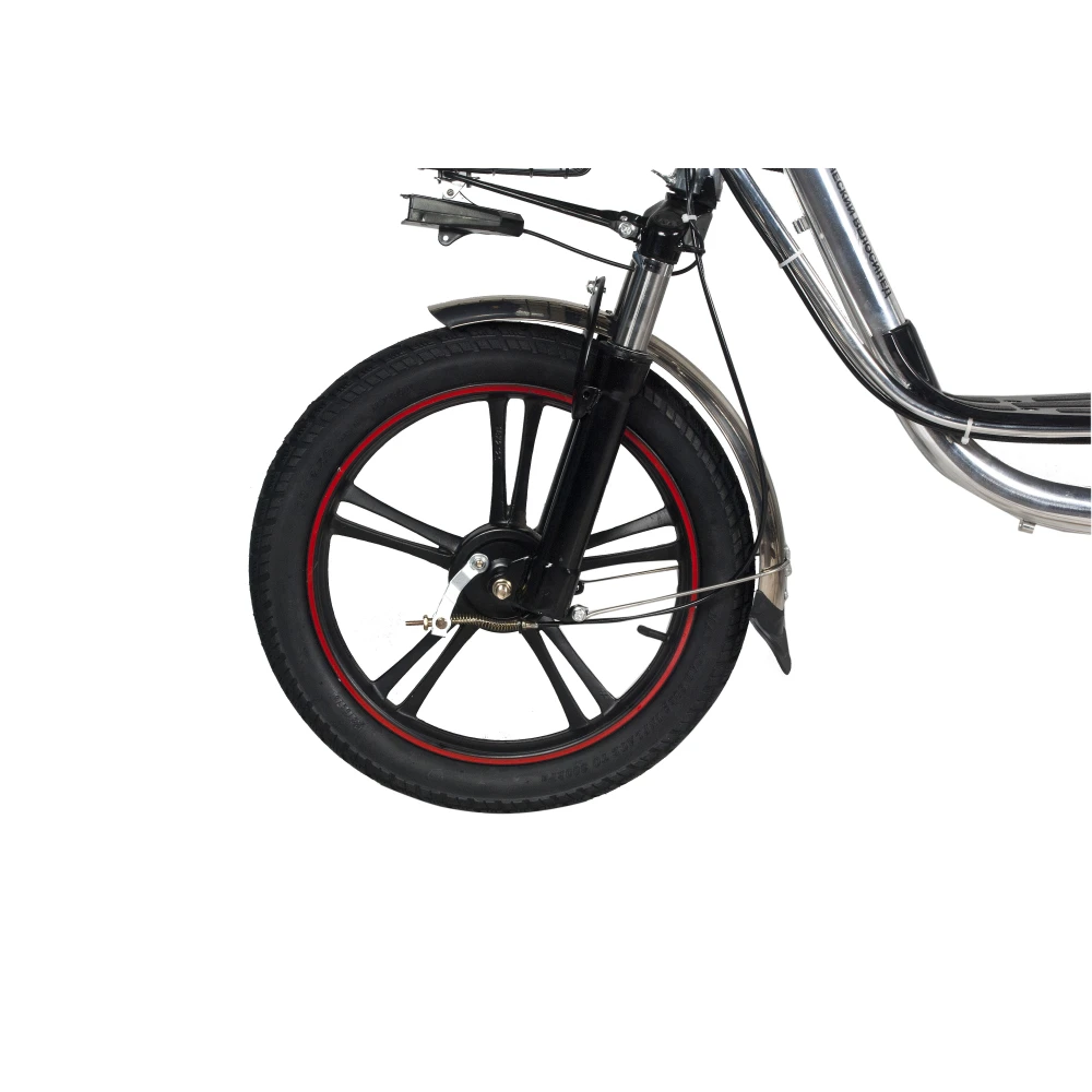 Электровелосипед изготовлен из сверхпрочного алюминия, не теряющего первоначальных характеристик при соблюдении требований производителя. Оснащена мотором мощностью 500 Вт, который в сочетании с емкой АКБ способен развивать скорость до 20-50 км/час и преодолевать до 80 км пути. Гидравлическая тормозная система, профессионализм райдера и надежно сцепляемые с грунтом внедорожные колеса обеспечивают безопасность движения райдера.